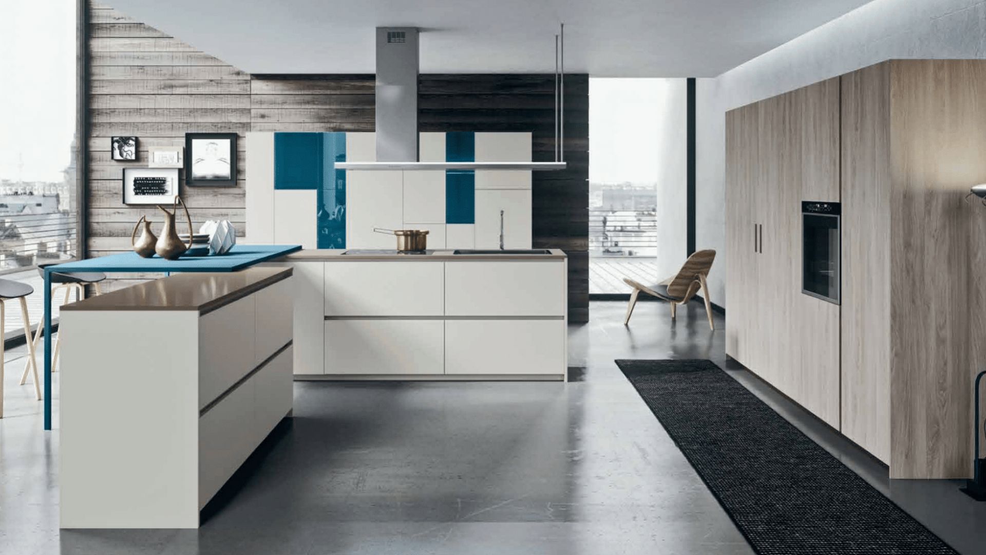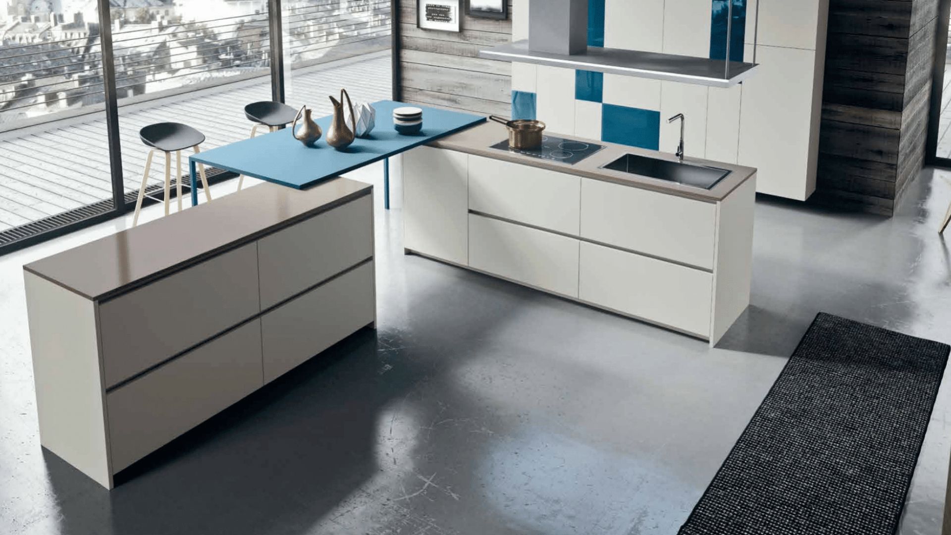 Cocina en blanco con mesa azul integrada y diseño urbano luminoso