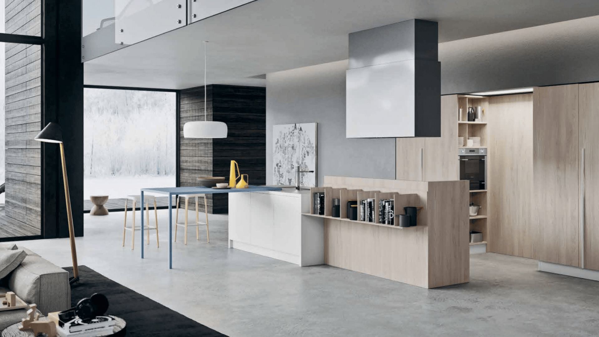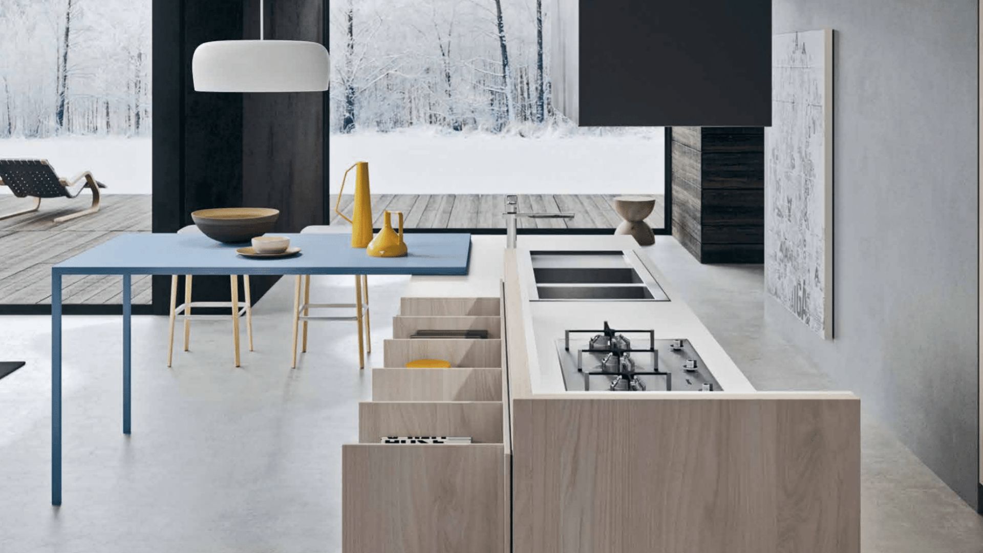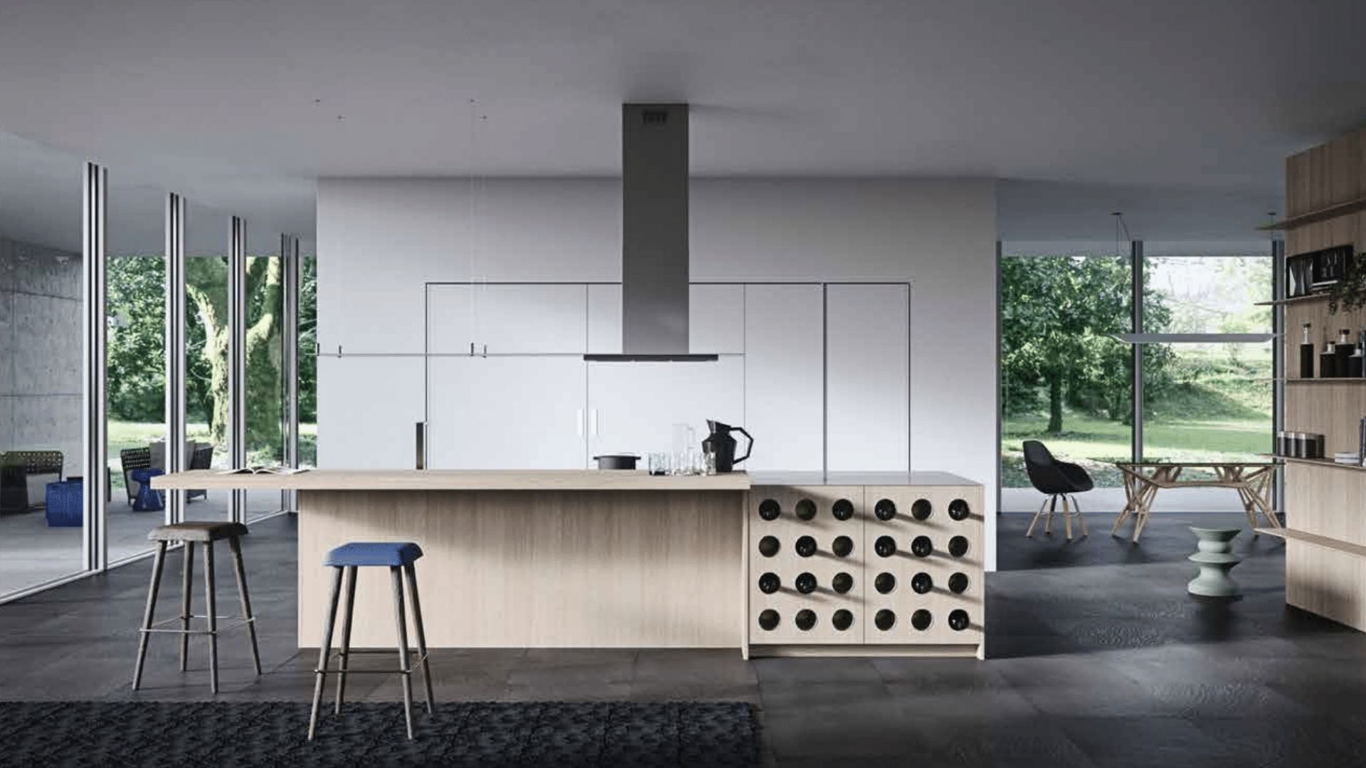 Cocina moderna con isla en madera clara y vinoteca integrada frente a ventanales panorámicos