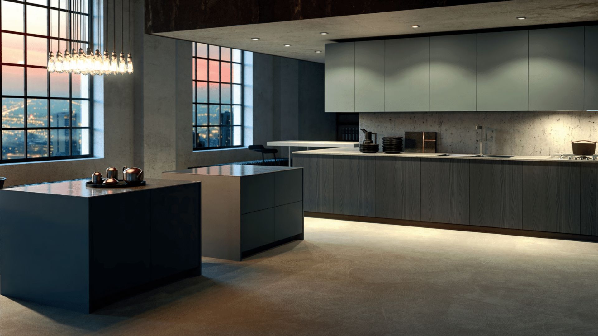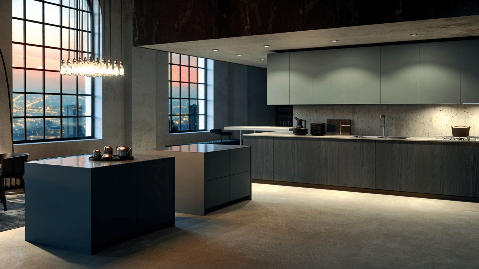 Cocina de estilo industrial con doble isla, mobiliario oscuro y luz ambiental cálida