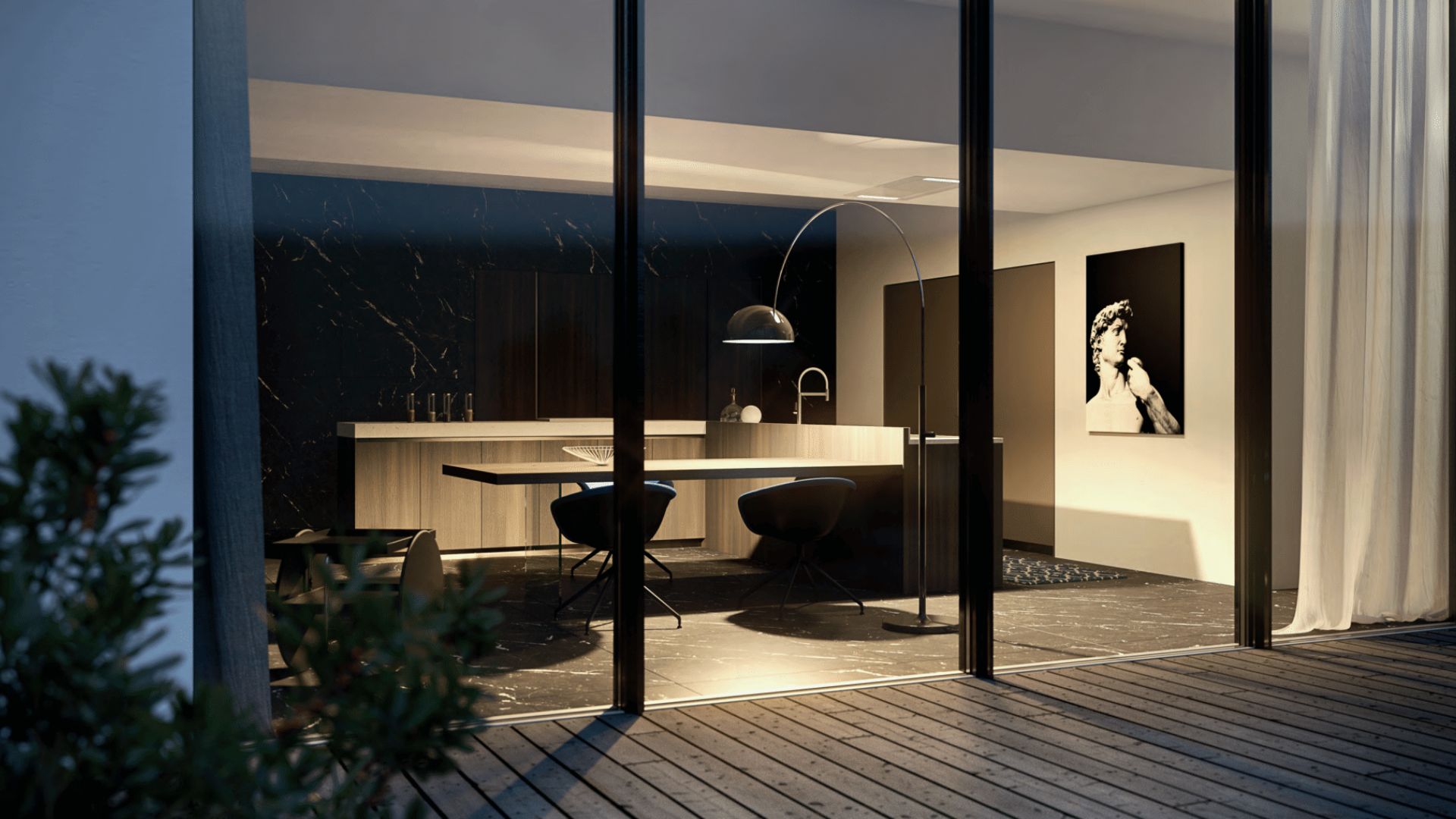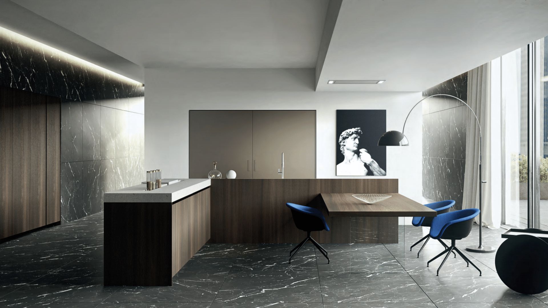 Cocina sofisticada con mármol negro y comedor integrado en un ambiente artístico