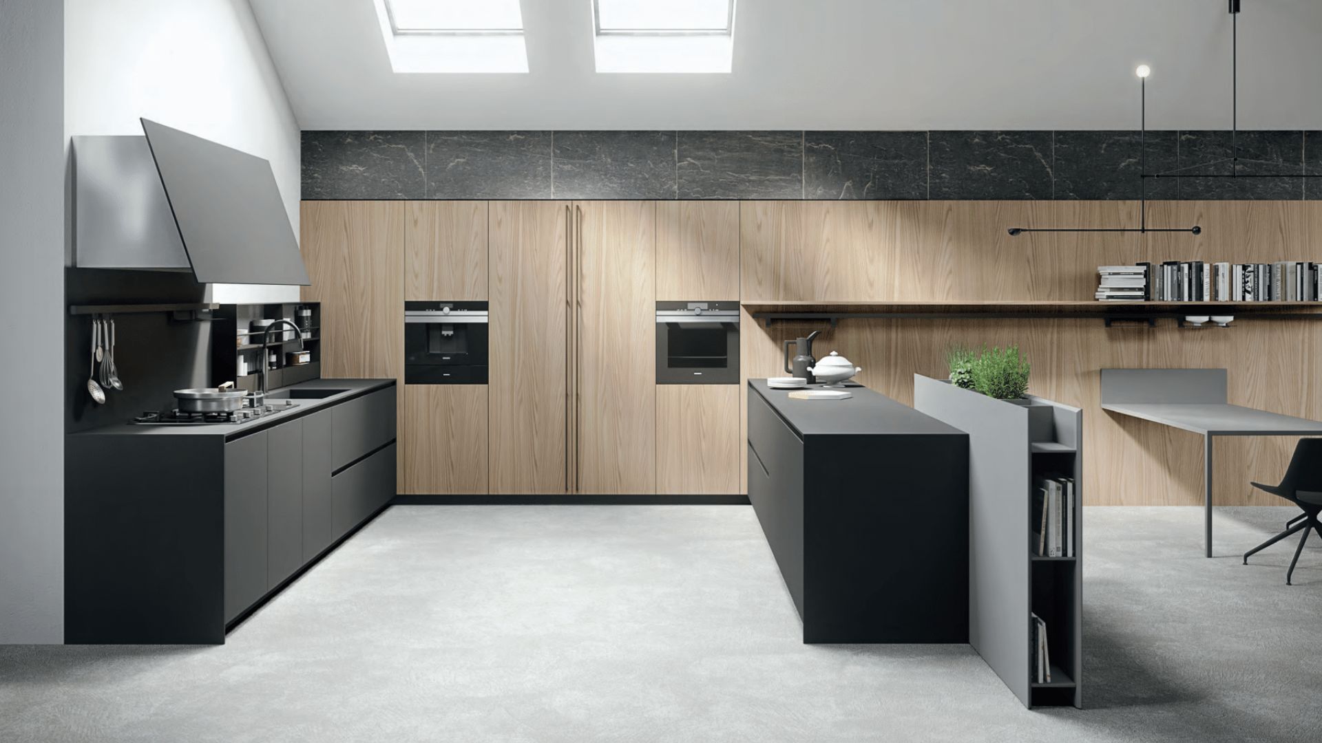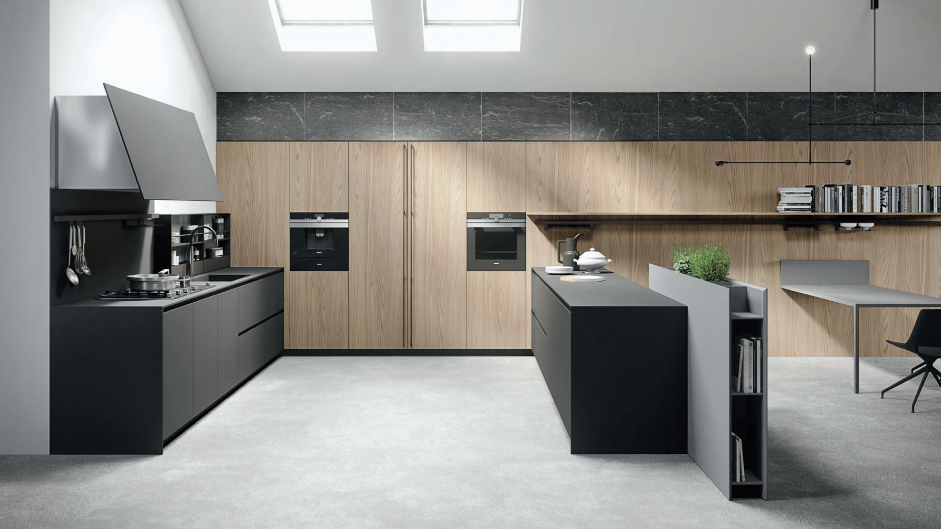 Cocina en negro mate y madera clara con isla central y escritorio integrado en el diseño