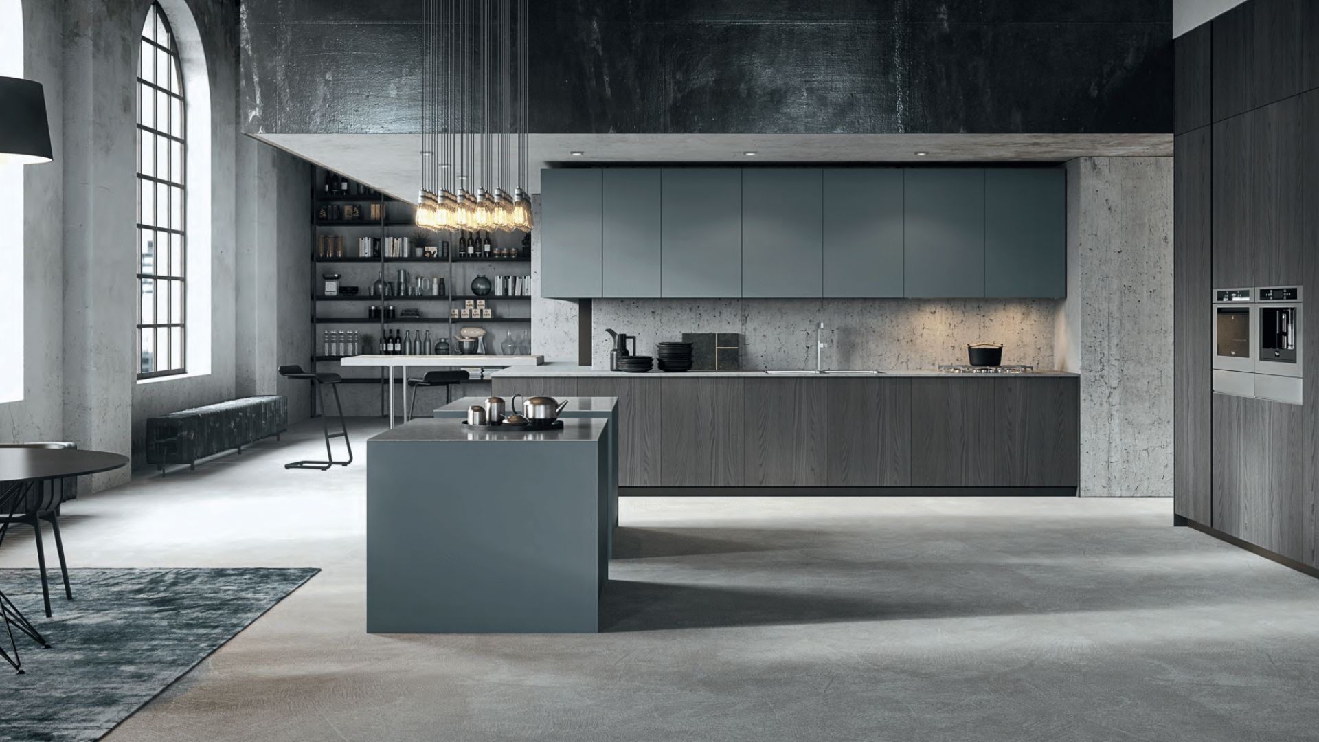 Cocina industrial con isla gris, mobiliario de madera oscura y estanterías abiertas bajo estructura de hormigón