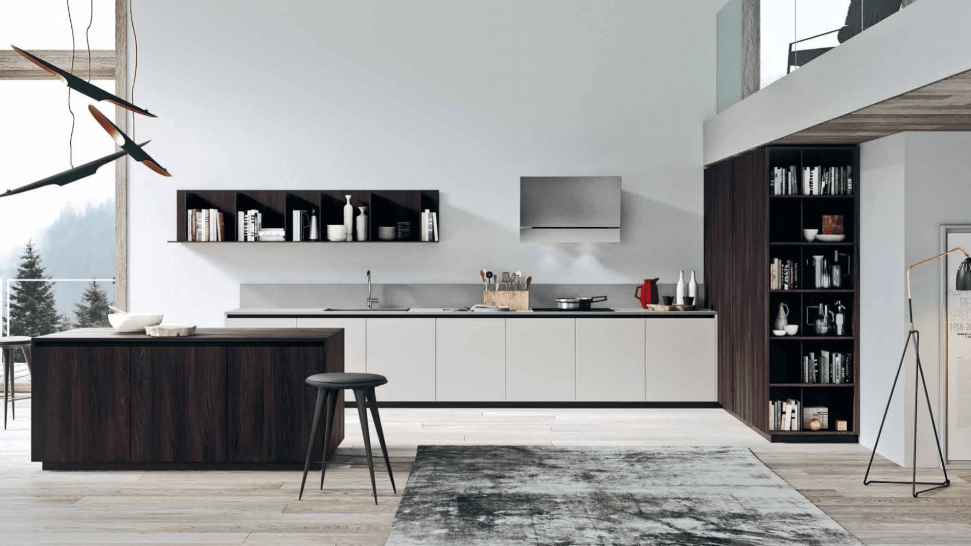 Cocina abierta con isla en madera oscura, estanterías abiertas y diseño conectado al salón y altillo