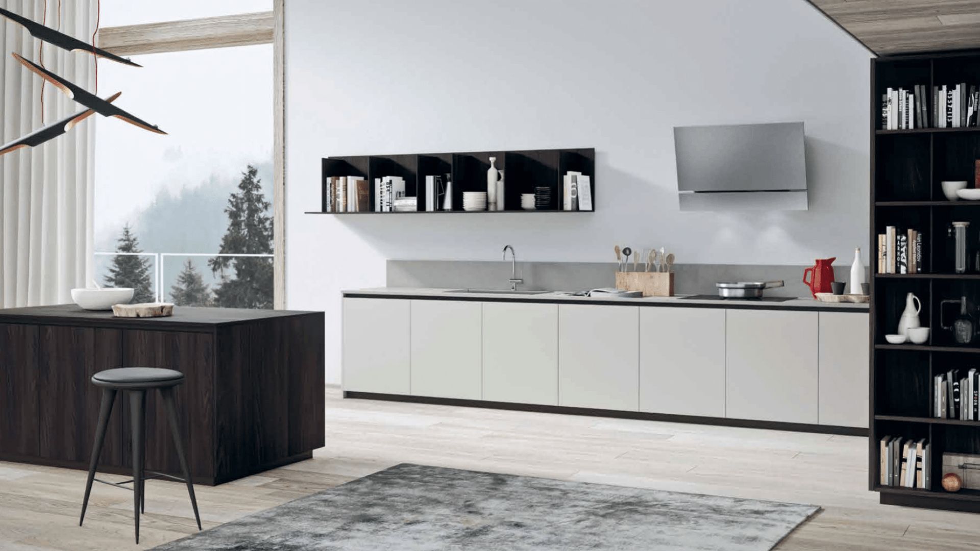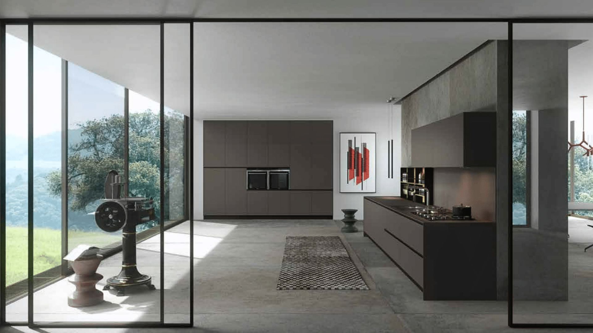 Cocina en tonos oscuros con distribución lineal y grandes ventanales con vistas al exterior