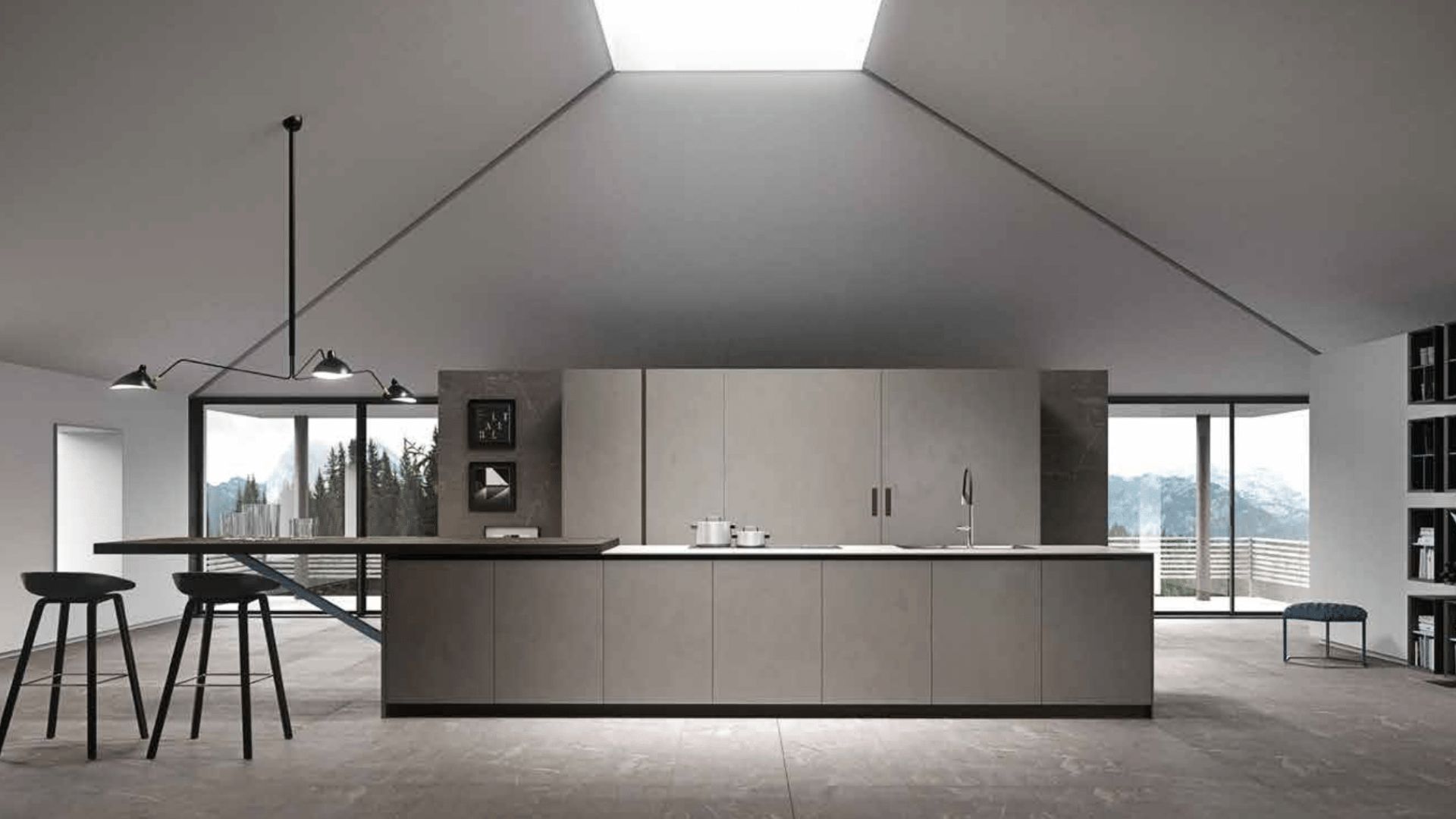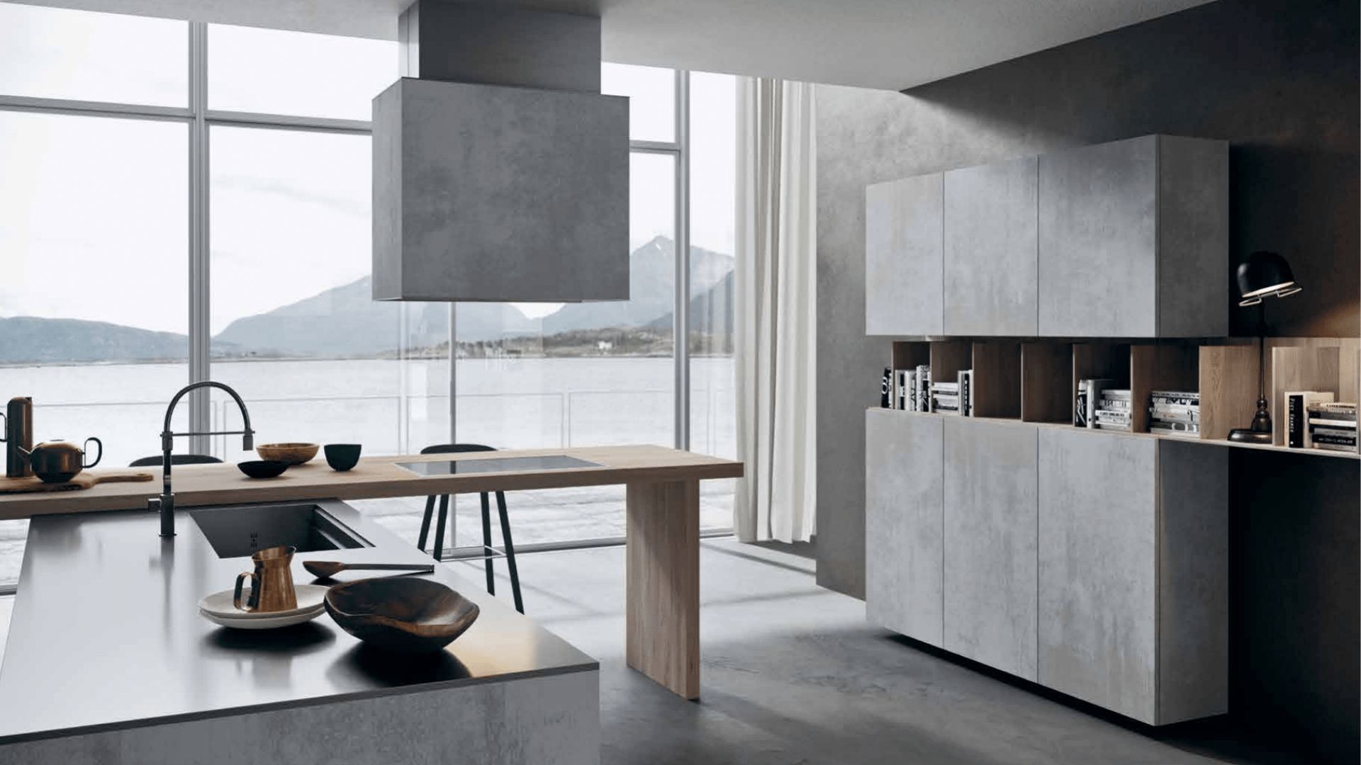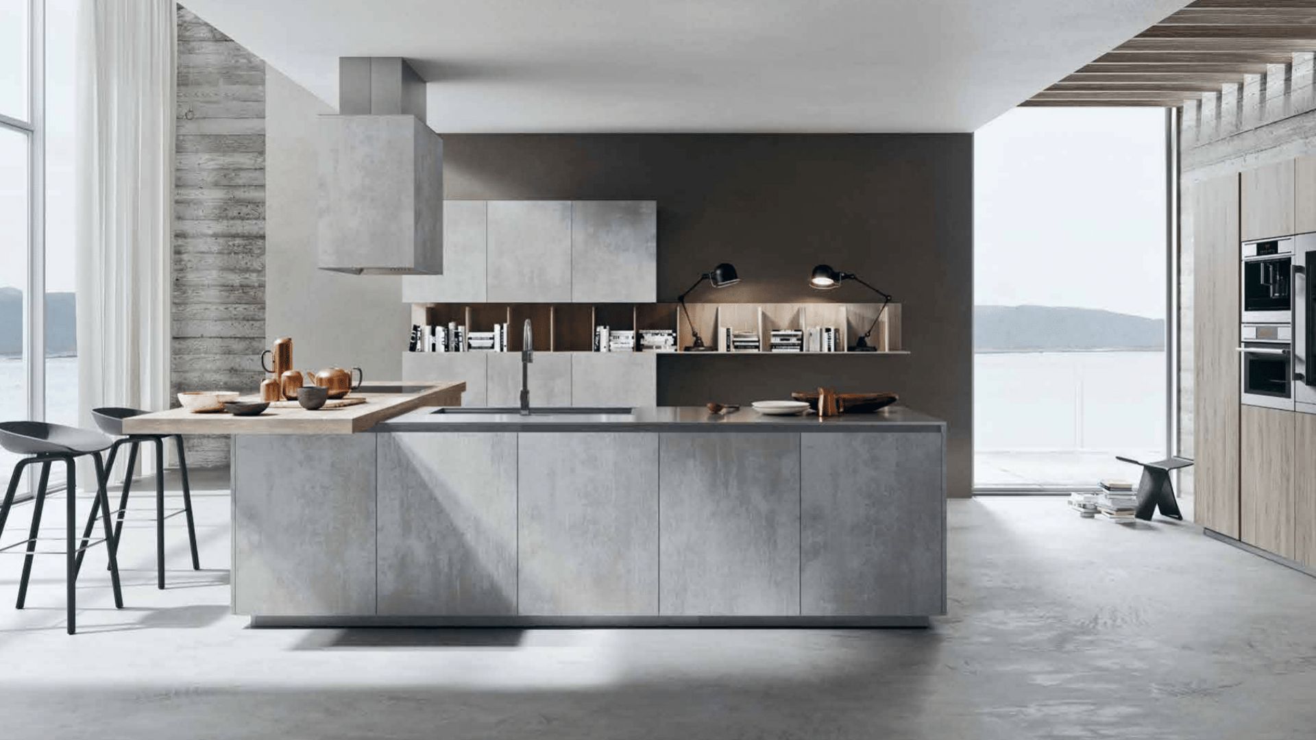 Cocina con acabado hormigón, barra de madera integrada e impresionantes vistas al paisaje