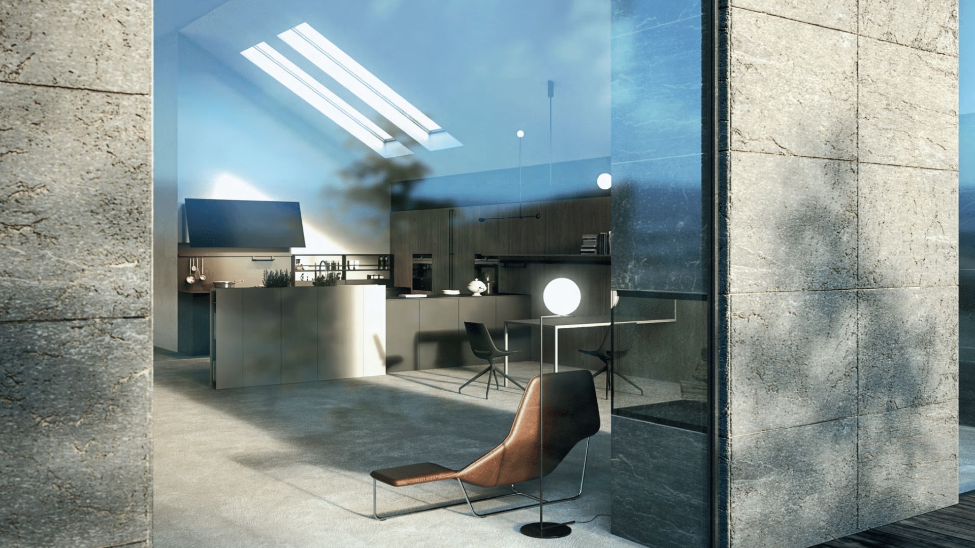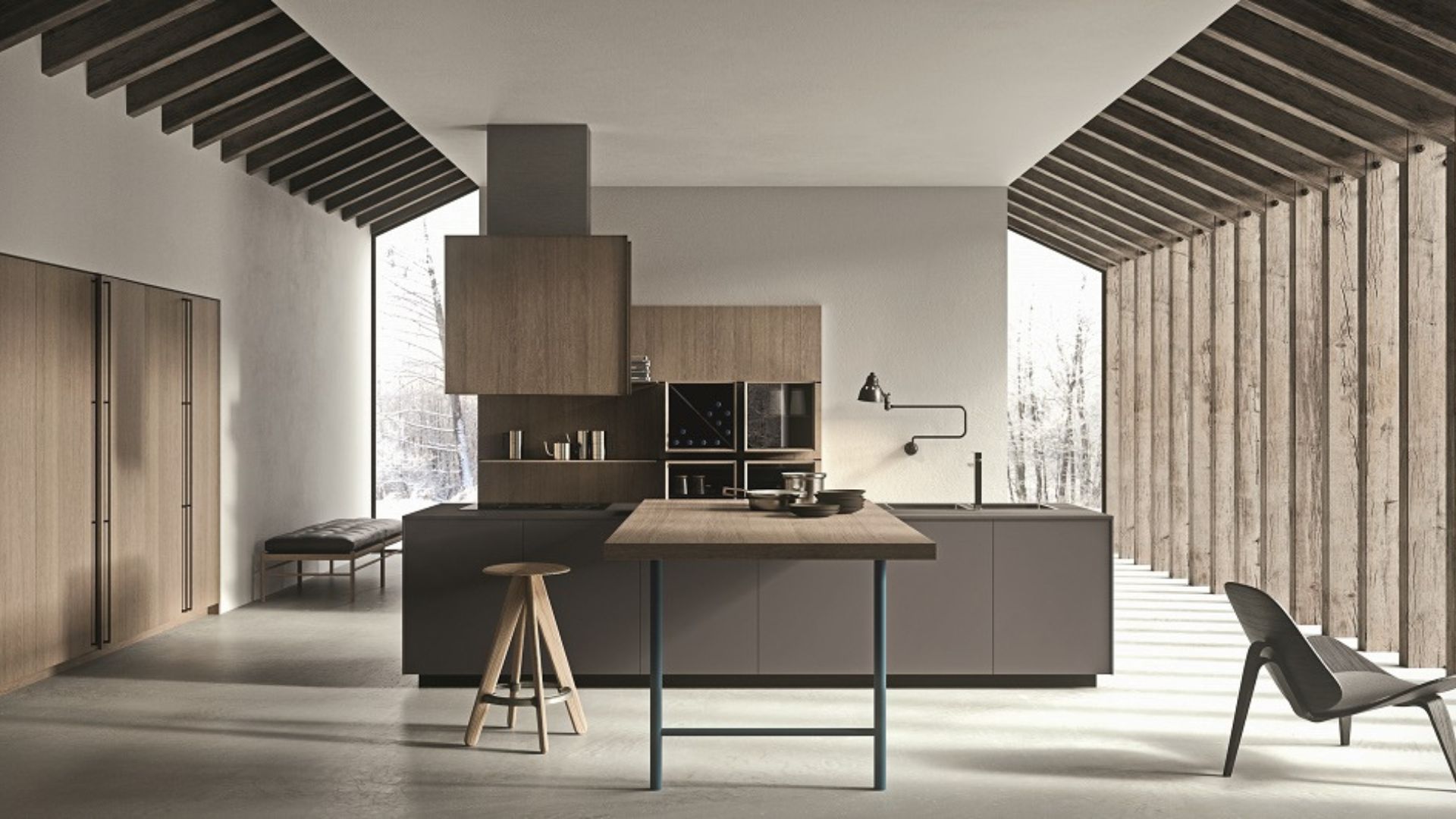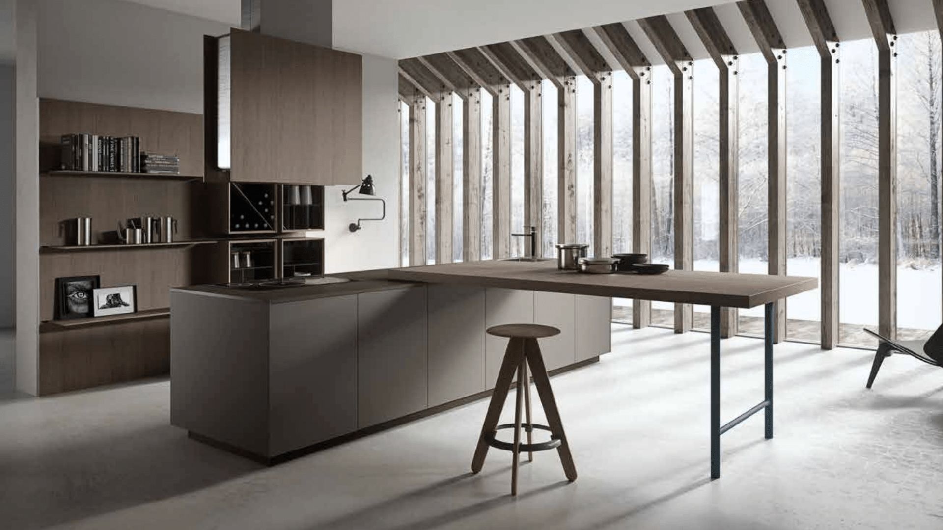 Cocina con acabado hormigón, barra de madera integrada e impresionantes vistas al paisaje