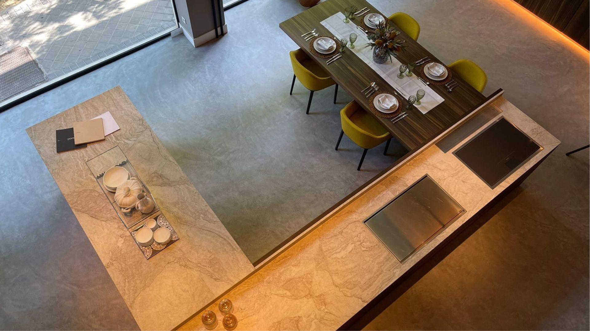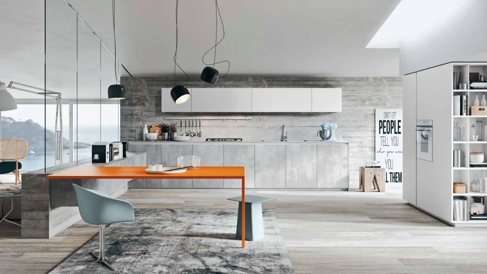 Cocina con muebles efecto cemento, mesa naranja y diseño abierto con mucha luz natural