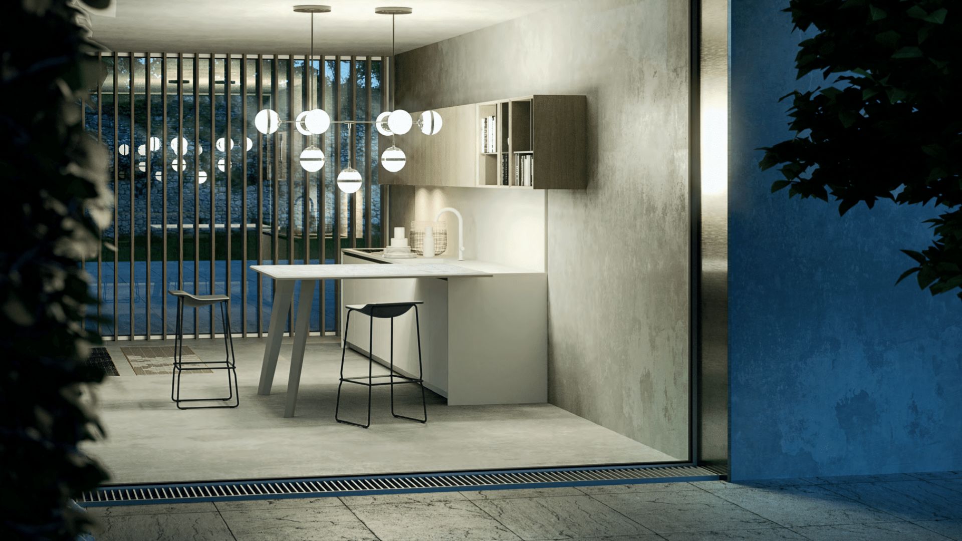 Cocina minimalista en blanco con barra integrada e iluminación decorativa en ambiente nocturno