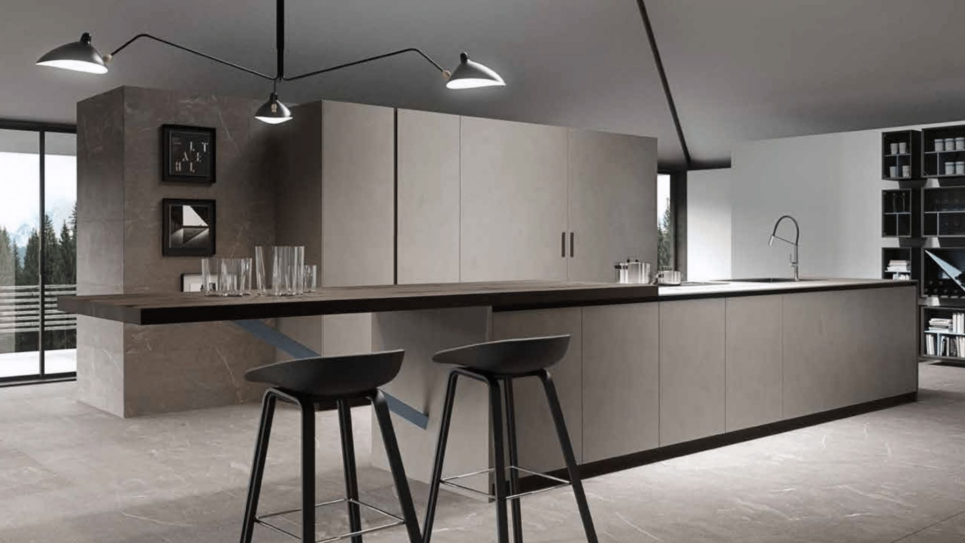 Cocina en tonos piedra con barra volada, mobiliario liso y diseño de líneas puras
