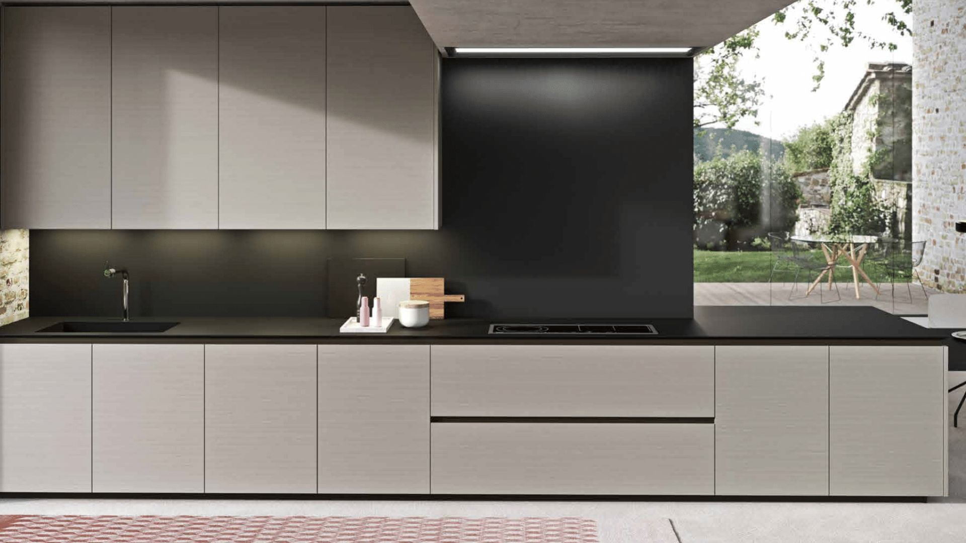 Cocina minimalista en gris claro con encimera negra y conexión directa con el exterior