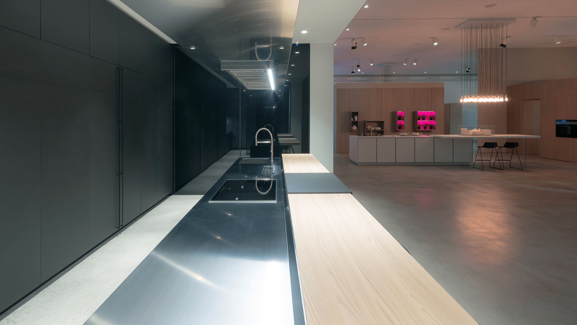 Cocina de estilo industrial con encimera de acero inoxidable y contraste entre madera clara y mobiliario negro