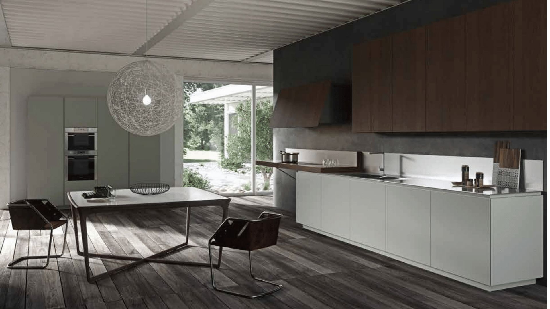 Cocina abierta al jardín con muebles en blanco mate y madera oscura