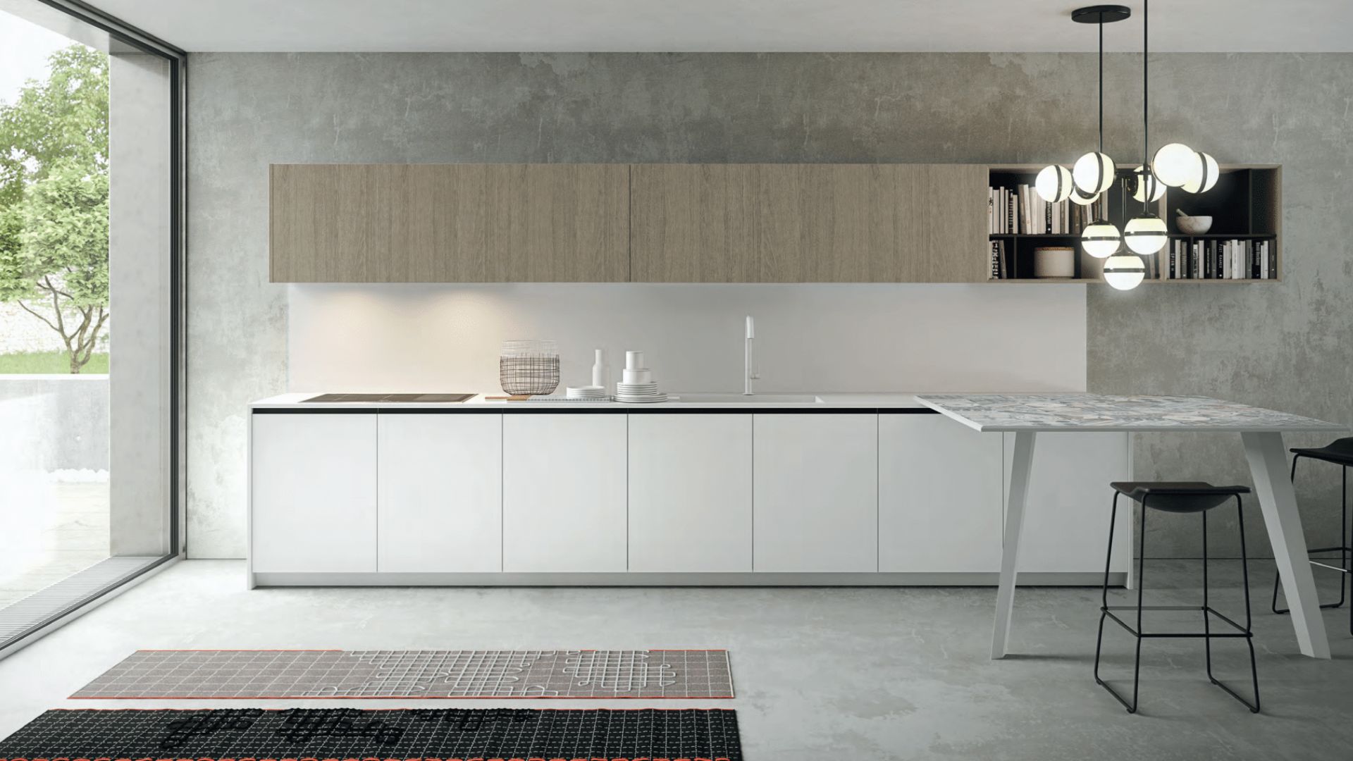 Cocina minimalista en blanco y madera con mesa integrada y luz natural