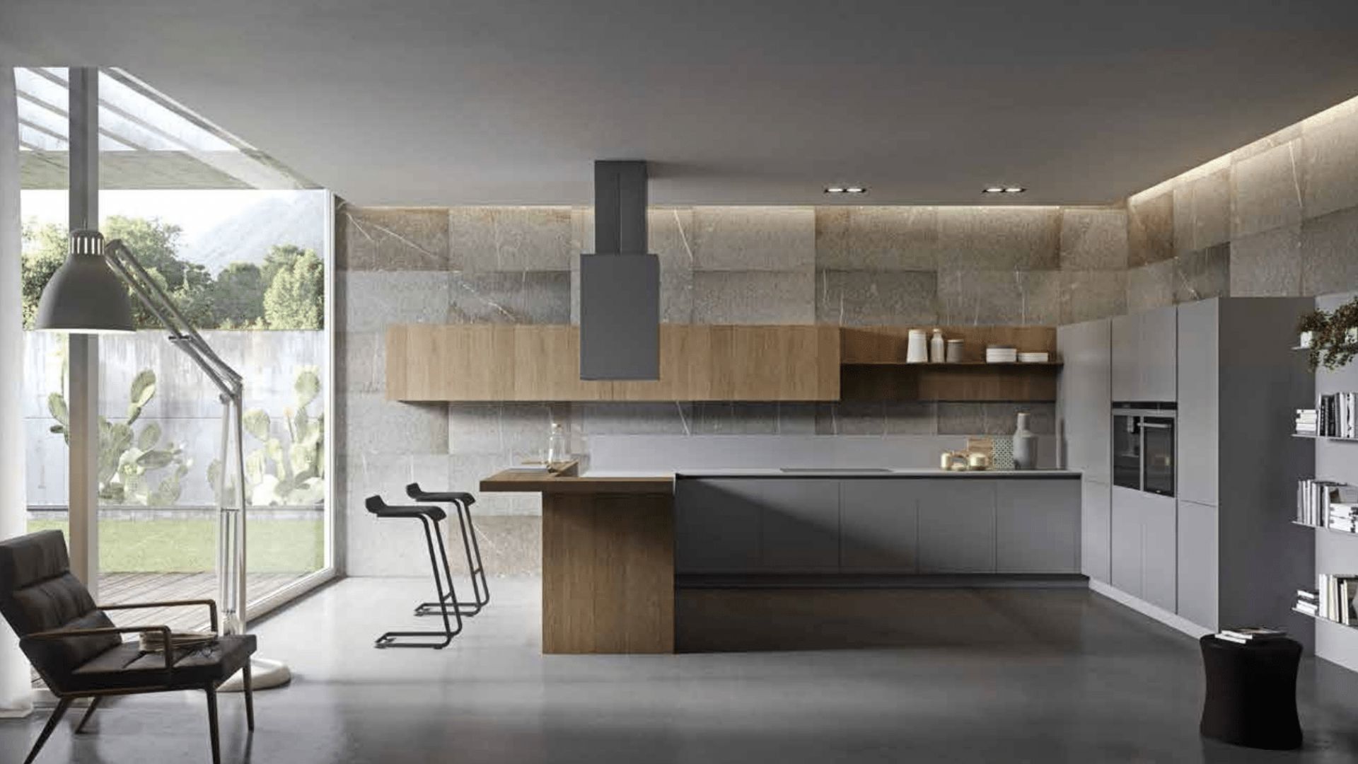 Cocina con isla de madera, muebles grises y pared de piedra natural en espacio abierto y luminoso